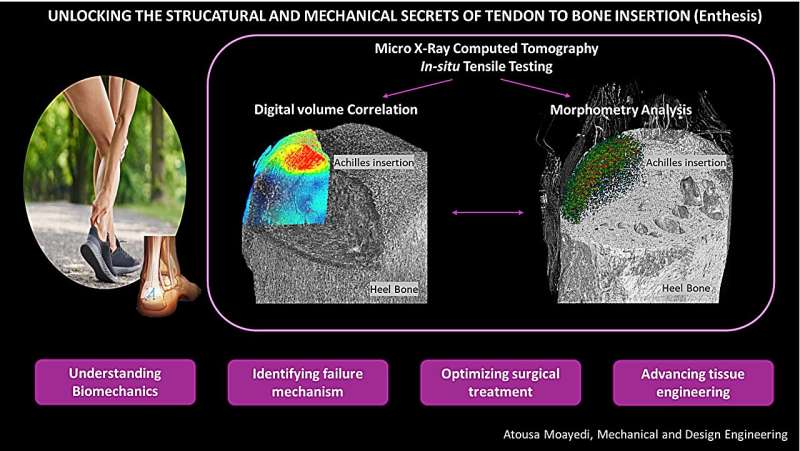 In areas where the microscopic cavities within the tissue (the lacunae) were more densely packed, the distortion was greater. This means that the way the tissue layers are arranged, and how thick they are, strongly influences how stretching (strain) is dispersed where the tendon meets the bone.