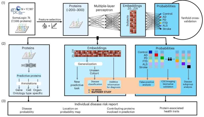 The symptom profiles of different neurodegenerative diseases often overlap, and diagnosing age-related cognitive symptoms is complex. A patient may have multiple overlapping disease processes in the brain at the same time, for example, Alzheimer’s disease and Lewy body disease, especially in the early stages of cognitive decline. Now, researchers at Lund University have developed an AI model showing that it is possible to detect several neurodegenerative diseases from a single blood sample. Their paper is published in the journal Nature Medicine.
