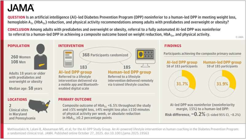 Published in JAMA Oct. 27, the study is believed to be the first phase III randomized controlled clinical trial to demonstrate that an AI-powered diabetes prevention program (DPP) app helps patients meet diabetes risk-reduction benchmarks established by the Centers for Disease Control and Prevention (CDC) at rates comparable to those in human-led programs.