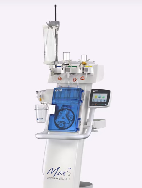 The Max 3™ injector is the first and only syringeless MRI injector available on the U.S. market. It is engineered for precise, efficient, and hygienic contrast delivery. The system simplifies MRI contrast administration with intuitive, step-by-step guidance via its user interface, helping technologists perform procedures quickly, confidently, and consistently. Its flexible design accommodates both single-use vials and multi-dose IBPs, allowing hospitals to tailor contrast delivery to their workflow, patient volume, and sustainability goals.