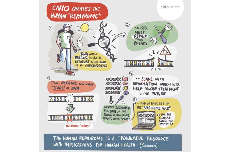 A research group at the CNIO has identified the 20,000 types of scars that remain in repaired human DNA after a break. They have subsequently organized them on a website, the human REPAIRome portal, available to the global scientific community. The human repairome is thus the catalog of scar patterns in repaired human DNA.