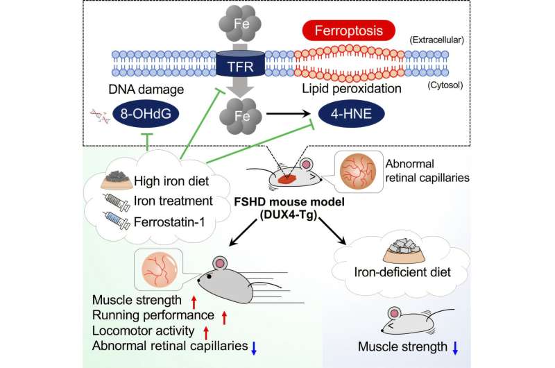 In the new study, the research team focused on iron metabolism, a critical regulator of oxidative stress. Using a genetically engineered mouse model that conditionally expresses DUX4 in skeletal muscle, the researchers found that DUX4 disrupted intracellular iron homeostasis, leading to iron accumulation in muscle tissue.