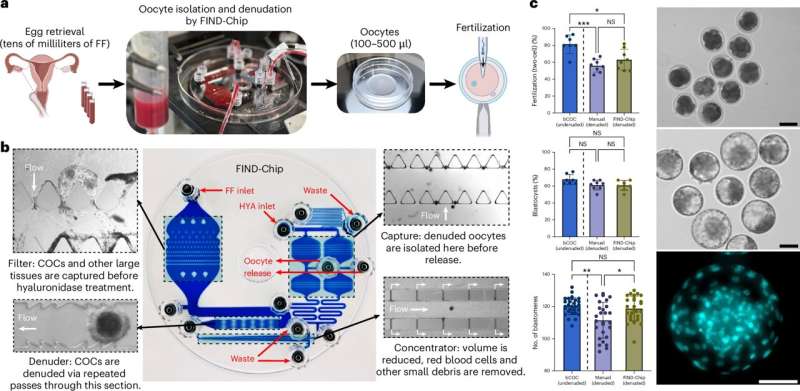The team created a microfluidic device called the FIND-Chip that searches follicular fluid to find and clean eggs. Follicular fluid is guided into the chip, which contains a network of tiny channels and an array of microscopic pillars. These act like a sieve to catch the eggs while smaller waste and fluid pass through.