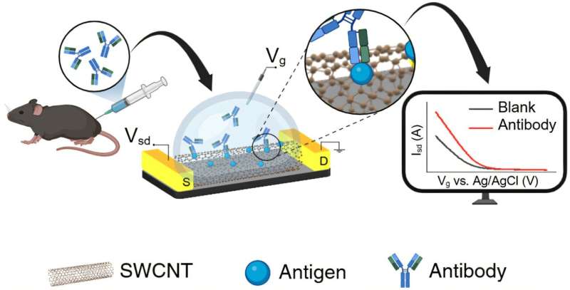 The sensor uses a virus-specific antigen attached to a carbon nanotube, which is 100,000 times smaller than a human hair. The sensor can be attached painlessly on the skin using a microneedle array which samples the fluids between skin cells. When an antibody binds to its partner antigen, the electrical properties of the nanotubes change, indicating their presence.