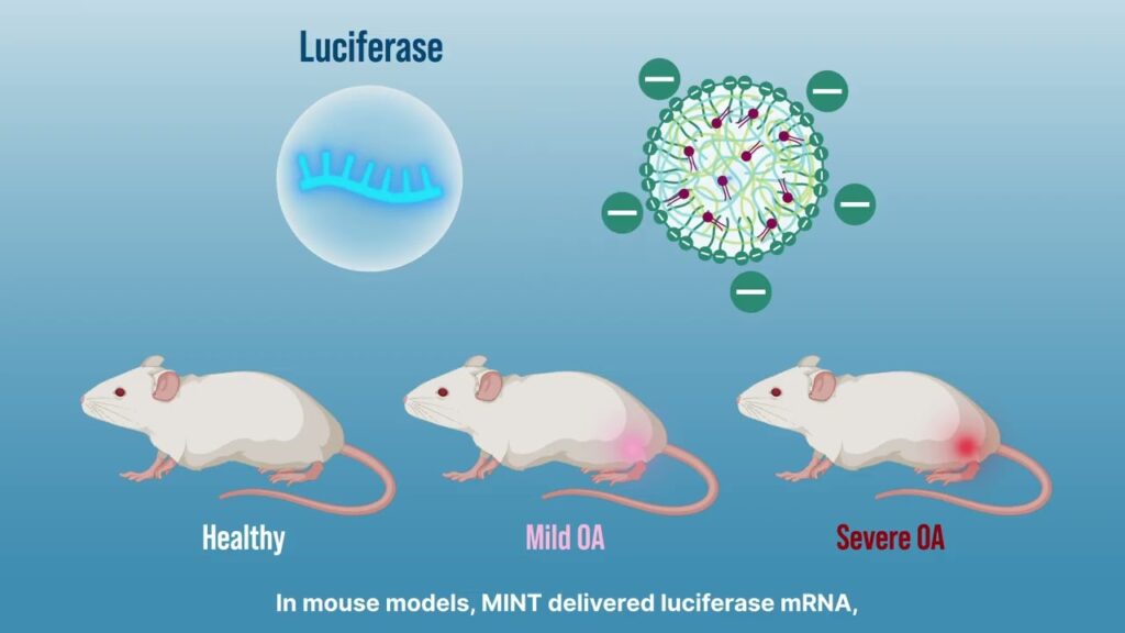 In a mouse model of OA, intra-articular delivery of luciferase messenger RNA-loaded MINT NPs demonstrated disease-severity-responsive expression. Using this strategy, we delivered ghrelin mRNA, as ghrelin has shown chondroprotection properties previously. Ghrelin mRNA-loaded MINT NPs reduced cartilage degeneration, subchondral bone thickening and nociceptive pain. Our findings highlight the potential of ghrelin mRNA delivery as a disease-modifying therapy for OA and the platform’s potential for lesion-targeted RNA delivery responsive to disease severity.