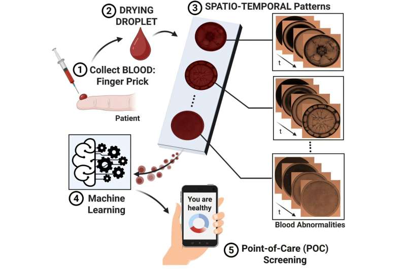 In the workflow, biofluid droplet images are analyzed by machine-learning algorithms to diagnose disease. Remarkably, the technology relies on the drying process of biofluid droplets to distinguish between normal and abnormal samples.