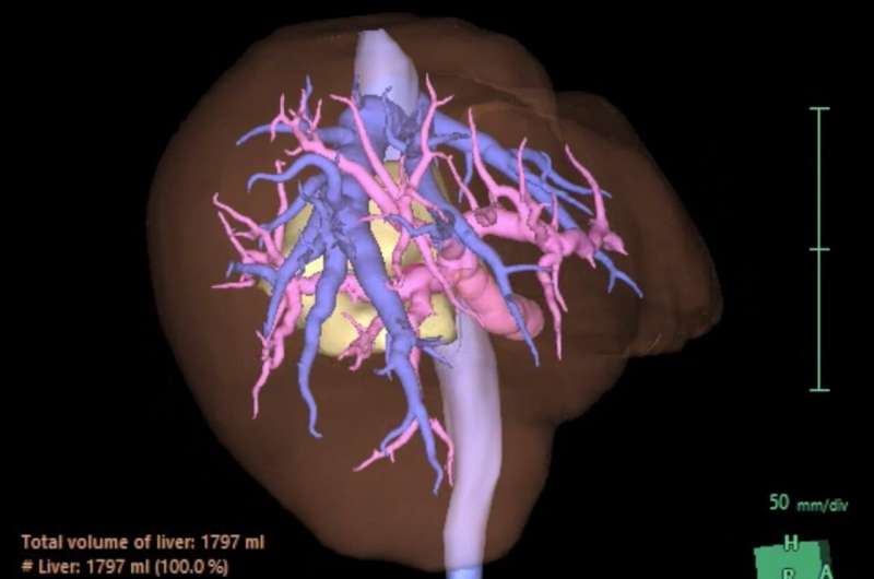 The researchers describe step-by-step a surgical technique they used to treat a 79-year-old patient who had rectal cancer and liver metastasis in the caudate region. They began by using an intraoperative ultrasound to find the tumor and map nearby important blood vessels. Using a surgical robot, they then used a hanging maneuver with the Arantius ligament to open a safe working space near major vessels.